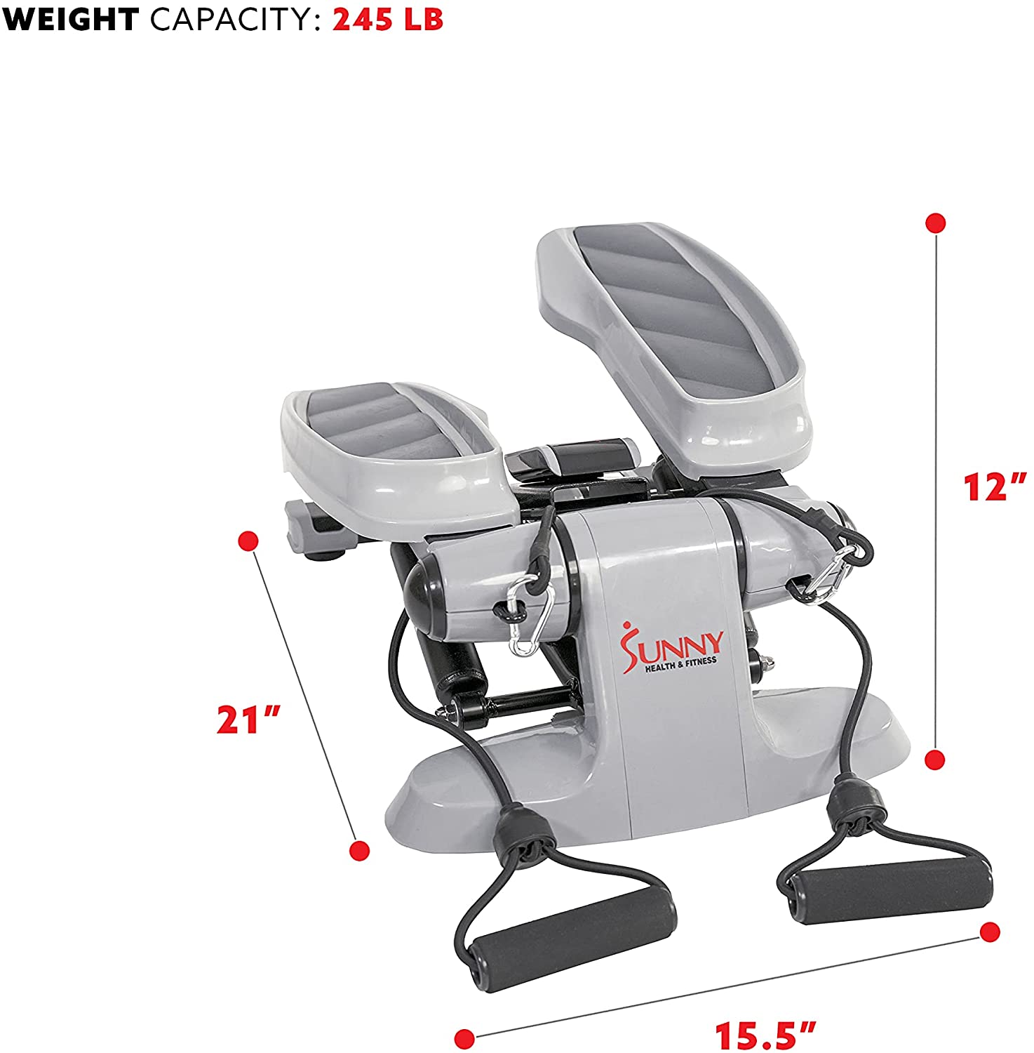 You can achieve a full-body, low-impact workout with minimal space by using the Sunny Health and Fitness SF-S0870 Versa Stepper. We’ve designed this stepper with a wide-body design and thick stabilizing feet to ensure maximum stability during your workout. Easily maintain balance on the ergonomic foot pedals that feature textured footpads. The quiet dual hydraulic-drive system, which supports up to 245 lb, is designed to condition your glutes, thighs, and calves as you step up and down. A glance at your time, calories burned, steps taken, and steps per minute with the convenient LCD. Attach the included removable resistance bands to perform upper-body exercises while you move. Feel confident in every step with the Sunny Health and Fitness SF-S0870 Versa Stepper.